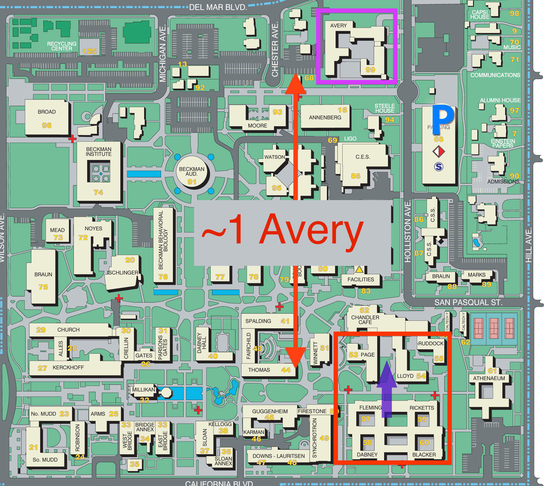 A map highlighting Caltech's undergrad housing and the distance of one Avery